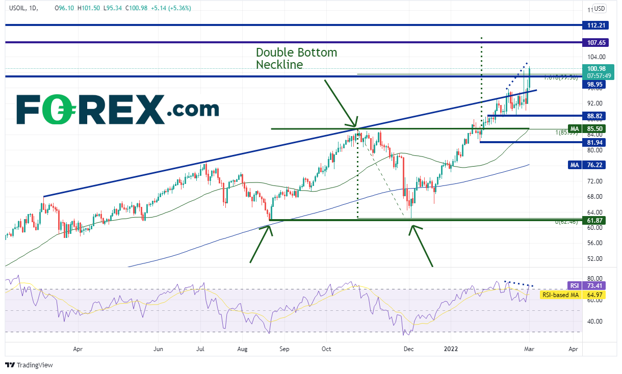 美国西得州原油在俄乌冲突爆发之前就已上涨了很长一段时间。油价在62.00附近构筑双底后于1月站上颈线。双底的目标在颈线突破位加上底部到颈线的高度,本例中在109.00附近。