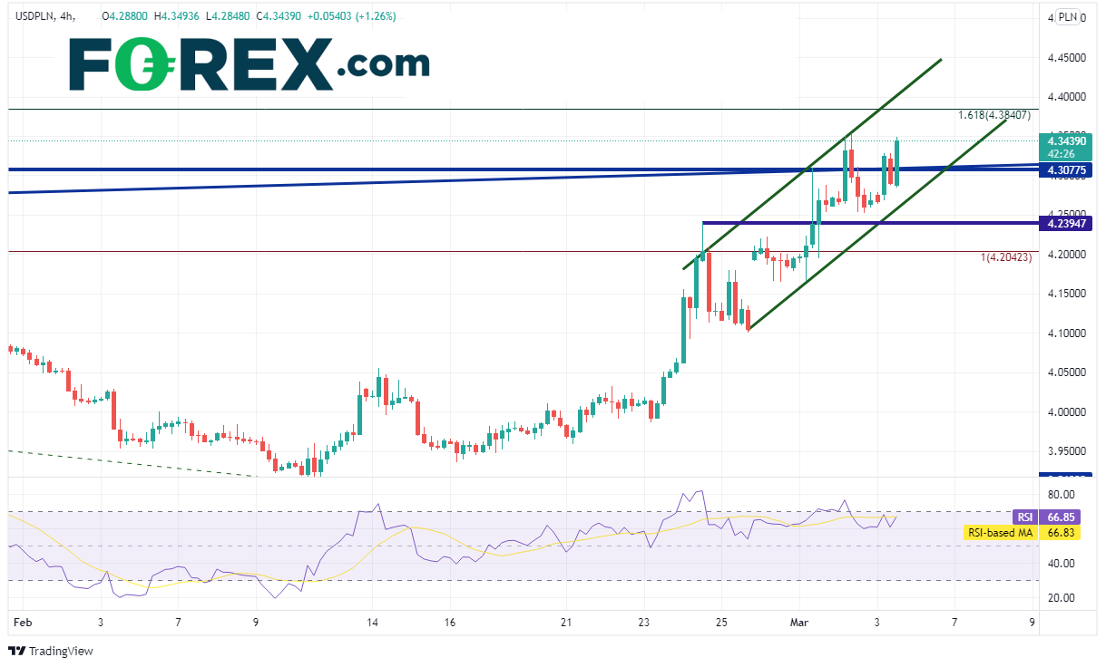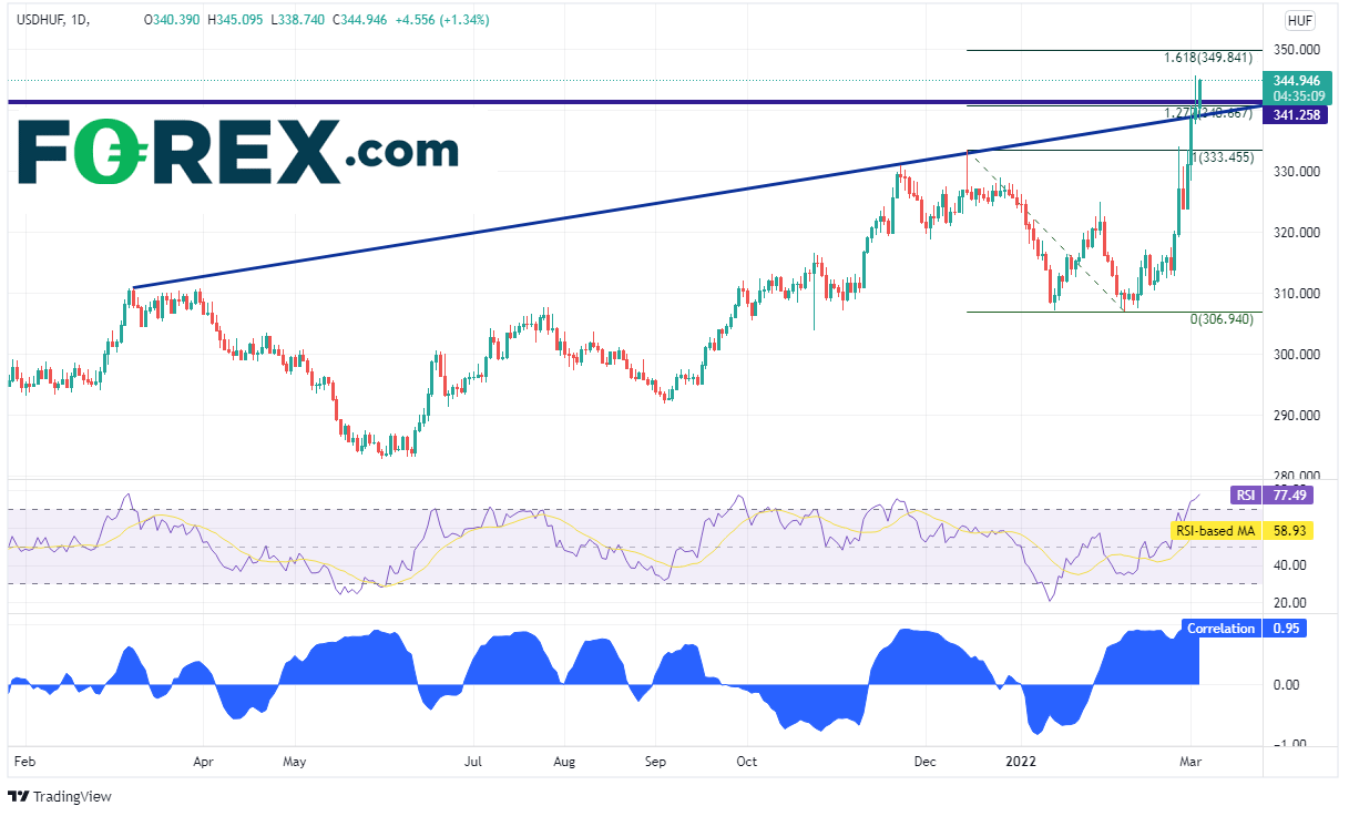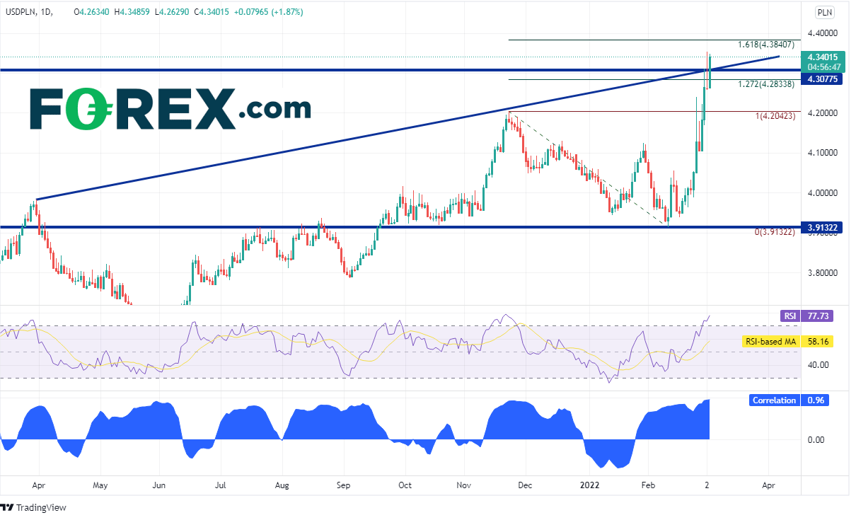 正如我们在周初所指出,有一些东欧新兴市场货币和美元/俄罗斯卢布之间存在高度相关性。美元/波兰兹罗提和美元/卢布目前的相关系数为+0.96。如果相关系数为+1.00,表明两个交易产品之间完美正相关,完全同向波动,而+0.96的读数相当接近+1.00。美元/波兰兹罗提两次击穿历史高点4.3078但都未能收于其上,直到今天才成功收上该位且攻克2021年3月31日以来的趋势线。