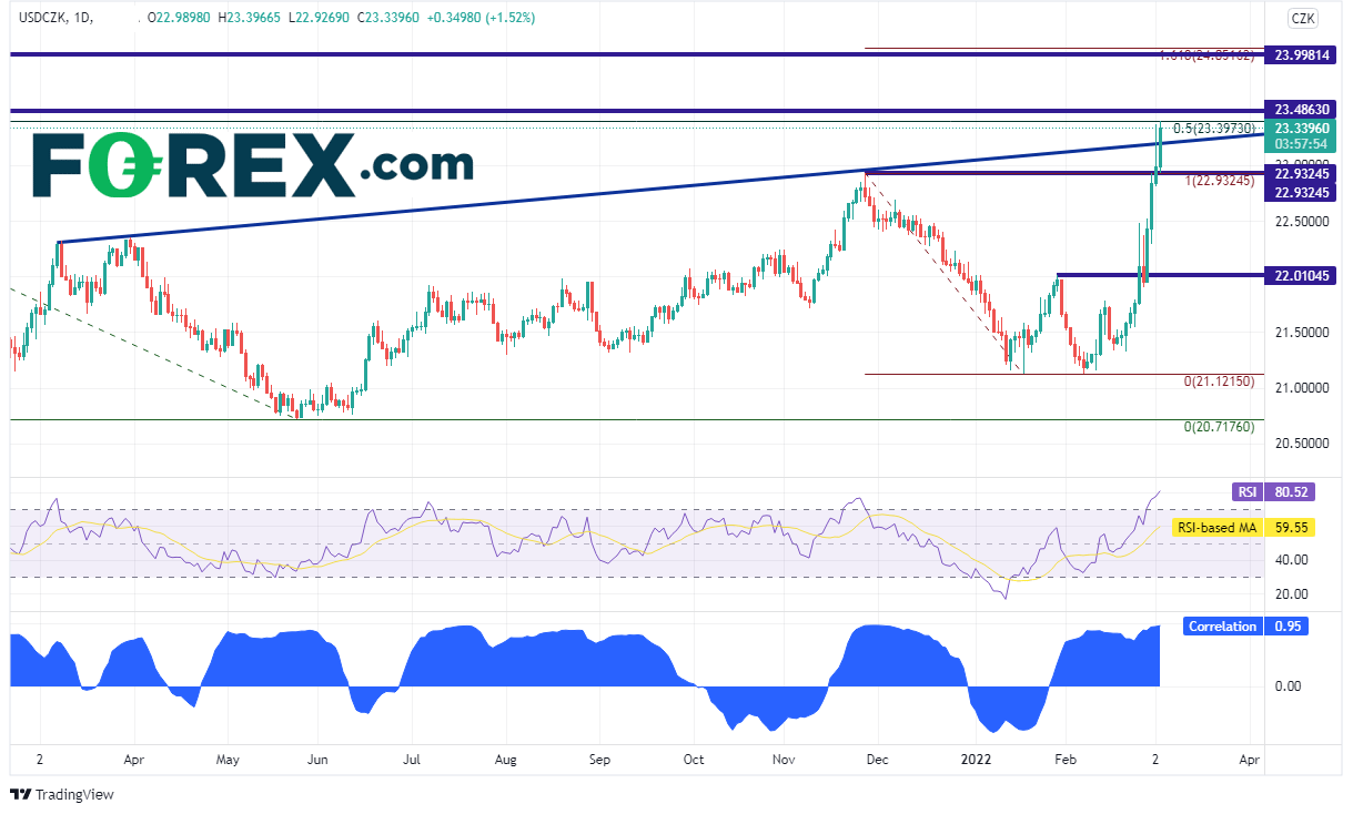 快速浏览美元/捷克克朗后我们发现其与美元/卢布之间的相关系数同样处于非常高的+0.95水平,只是目前没有像美元/波兰兹罗提和美元/匈牙利福林那样交投于历史高点(26.50)附近。美元/捷克克朗站上12月15日以来的前高点和3月5日以来趋势线,目前挑战2020年3月高点跌至2021年5月低点行情的50%回档位,即23.3973附近。