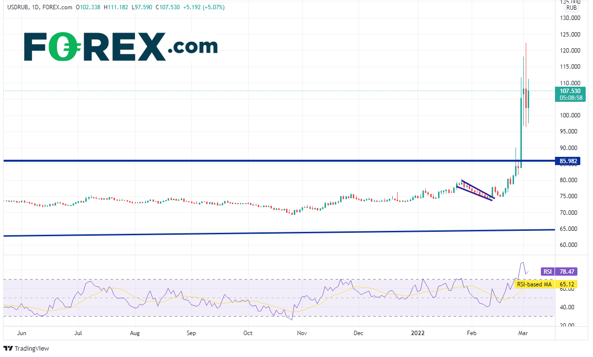 俄罗斯卢布的波动性达到空前的高度,美元/俄罗斯卢布于2月24日击穿历史高点85.98。但该货币对在上周末俄罗斯被踢出SWIFT之前还没有呈现暴涨的势头,直到前述制裁措施落地后才于周三飚升,盘中创下122.25历史高点。俄罗斯央行甚至表示再也无力阻止卢布的崩盘,很多银行与经纪商因此无法获得卢布货币对的报价(英国央行今天甚至宣布停止对卢布汇率进行报价)。不少交易者为无法参与交易卢布的波动性而感到沮丧。