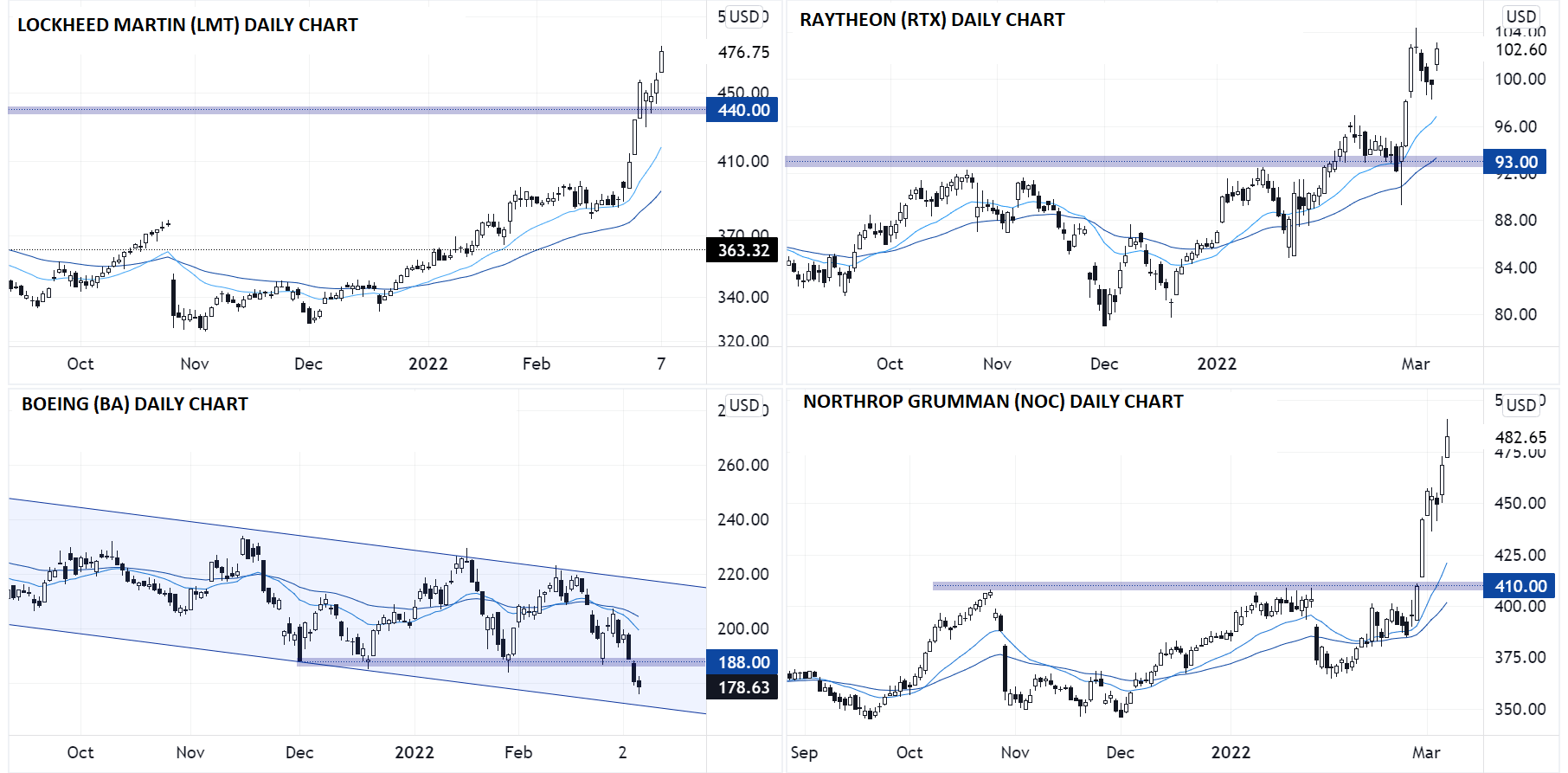 在未来数个季度里国防支出似将激增的背景下,无论俄乌冲突何时以及如何落幕,交易者都可能在未来数月里择机逢低买入Lockheed MartinRaytheon Technologies  Northrop Grumman,只要它们的股价守住前高点。而如果读者不想承担单只股票的特定风险,只想交易这一广泛主题,那么可以考虑iShares US Aerospace and Defense ETF (ITA)。这是交易型基金,持有国防股领域30多只股票,其中有近一半为上文提到的四大公司的股票。