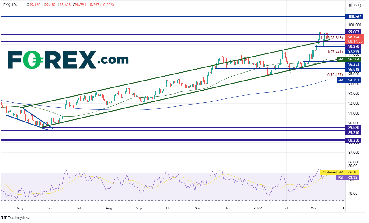 美元指数自20215月底以来有序走高并形成上涨通道,上周创下20205月以来最高点99.42,站上了通道的上轨趋势线,尾盘一度尝试回到通道内但以失败告终,目前的阻力在129日高点到24日低点行情的161.8%扩展位98.96附近。