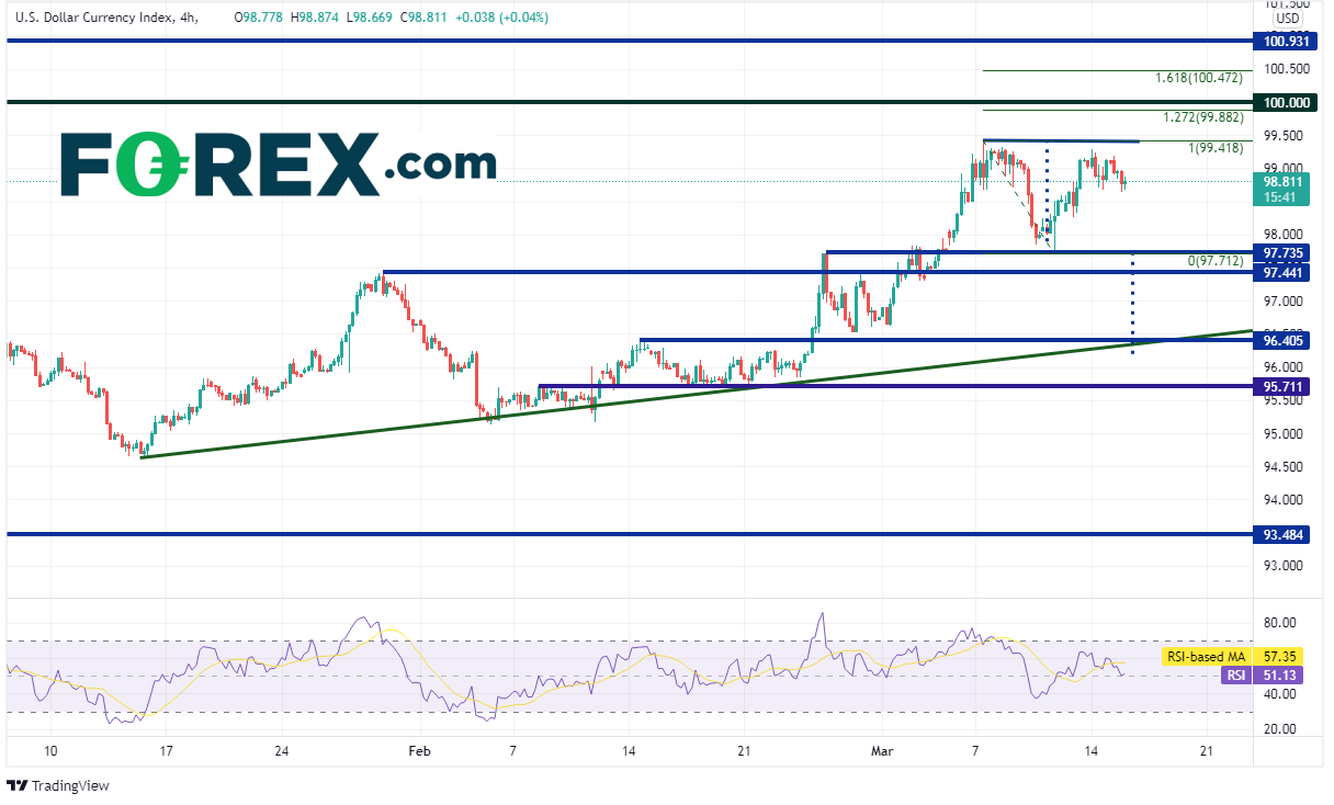 美元指数4小时图可能正在构筑双顶形态,如果突破97.73支撑位,或确认前述形态成立并剑指96.21的下档目标。但要到达此目标,首先必须击穿97.44支撑位。该位下方是由214日高点和114日以来上升趋势线组成的支撑位,即96.40附近。请注意,日图上50天均线也在这些价位附近,落在96.50。第一个阻力位在37日高点99.42,然后是由37日高点到310日低点行情的127.2%扩展位99.82,以及100.00的整数心理关口和100.47附近的161.8%扩展位。