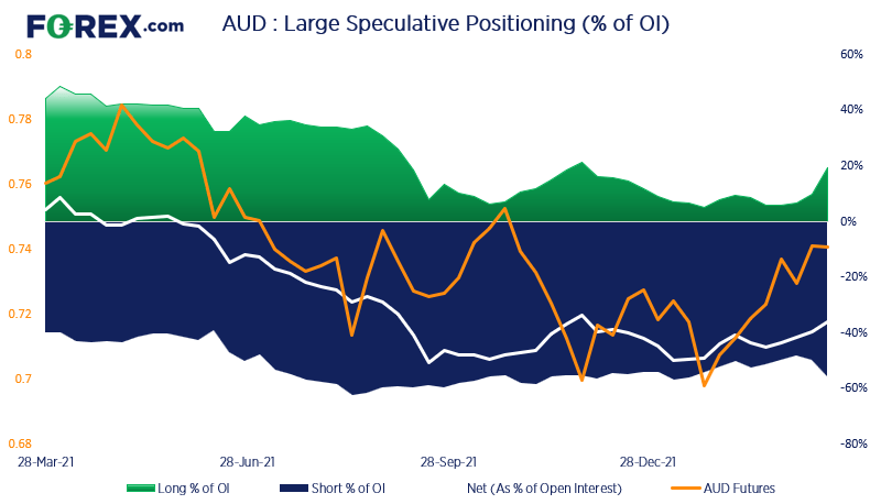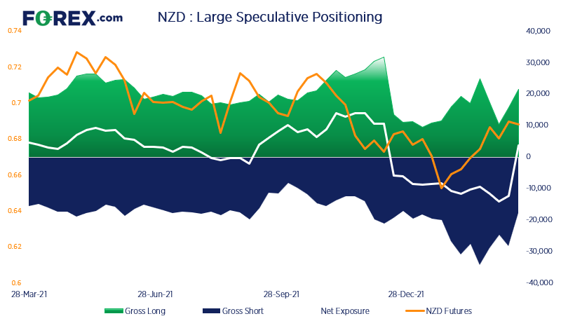 上周澳元净空头锐减,幅度为33400张,是20153月以来之最。空头合约减少28600张,为20203月以来速度最快的空头回补,而多头合约增加4800张。地缘政治与供应关切导致大宗商品价格强力反弹,携手立场强硬的美联储和温和程度减弱的澳洲联储,最终压垮强弩之末的空头,并推动澳元汇率回到74上方。如果澳洲联储进一步表露强硬立场,则我们可以说澳元甚至可能回到80上方。
