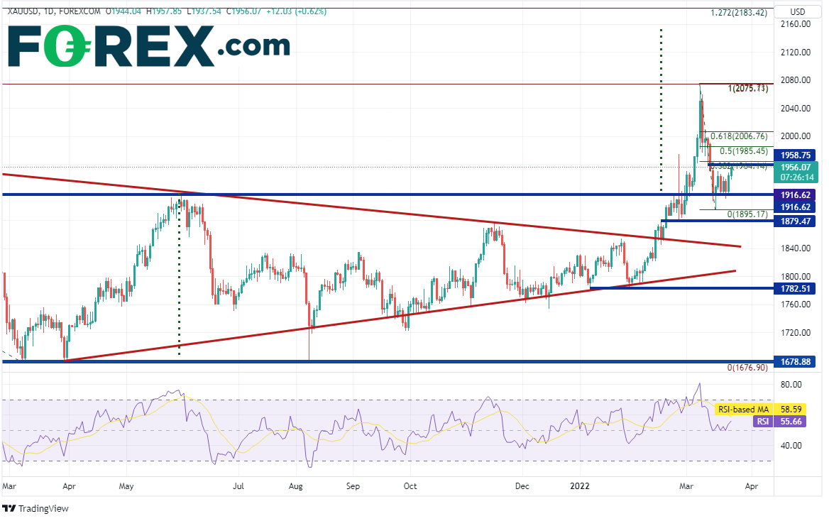 担心着俄乌冲突的投资者现在又添一层焦虑。美国总统拜登本周前往欧洲,与北约盟国商讨当前局势。双方会面后爆出的媒体头条显示,北约正在为发生俄罗斯核事件的风险做准备。拜登还跟北约说,支持北约在东线增派兵力。还有,此前有消息称,七国集团计划就俄罗斯使用化学武器和核武器对其发出警告。这些消息只会升级俄罗斯与西方国家之间的紧张关系,造成更多的不确定性。资金因此涌入黄金避险。