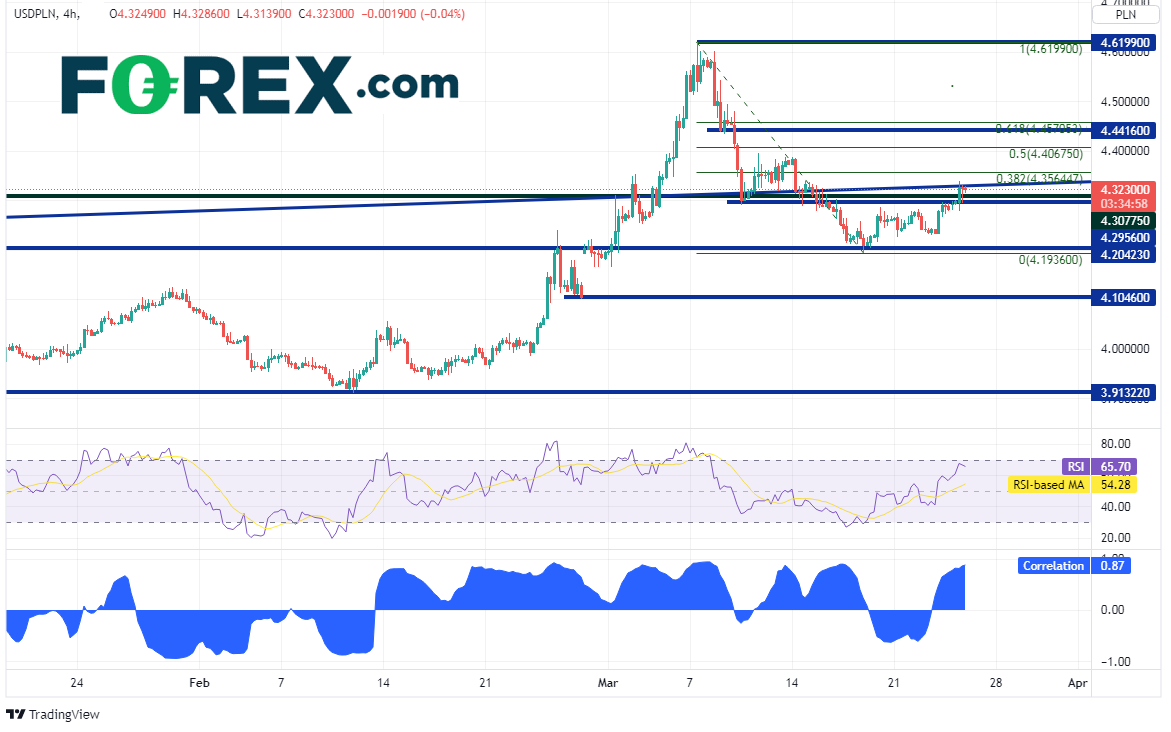 美元/波兰兹罗提和黄金之间存在高度正相关联系,目前两者的相关系数报在+0.81。高于+0.80的读数都被视为高相关性。美元/波兰兹罗提在俄罗斯入侵乌克兰后和黄金一样开始大举走高,于32日站上4.3078的前历史高点后攻城略地,在37日创下历史新高4.6199。该货币对此后回落至水平支撑位4.2042并且再度上扬。