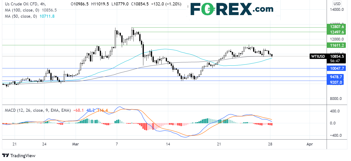 西得州原油上周相对受制于区间,上方面临阻力116.30,下方得到4小时图100期简单移动均线所在的108.50的支撑。