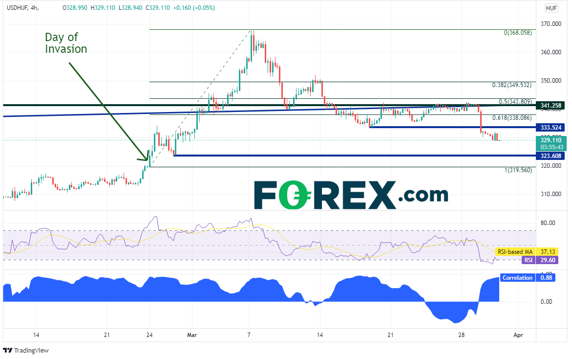 美元/匈牙利福林的情况和美元/波兰兹罗提差不多。美元/匈牙利福林和美元/卢布4小时图当前相关系数为+0.88,而且前者也下探入侵日前的突破位,但还有下行空间。水平支撑位在323.608,略高于2月24日的突破位319.56。请注意,RSI进入了超卖区域,价格或准备回升。上方水平阻力位落在333.52,下个阻力在前历史高点341.258。
