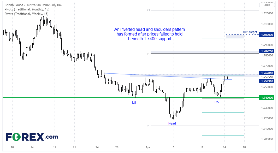 英镑/澳元过去两个月的下跌走势令人瞩目,但一直没有守住关键支撑位1.7400下方,现在反而呈现自其反弹的信号。我们可以看到价格在4小时图上形成了头肩底形态,大致目标在1.8000附近。请注意,公众假期之后将重设周图中枢点位(请看蓝色所示),但价格目前守在周图第一阻力位下方,期间目标在1.7745附近。如果攻克,可能上看月图中枢点位附近的1.7800和波段高点1.7842