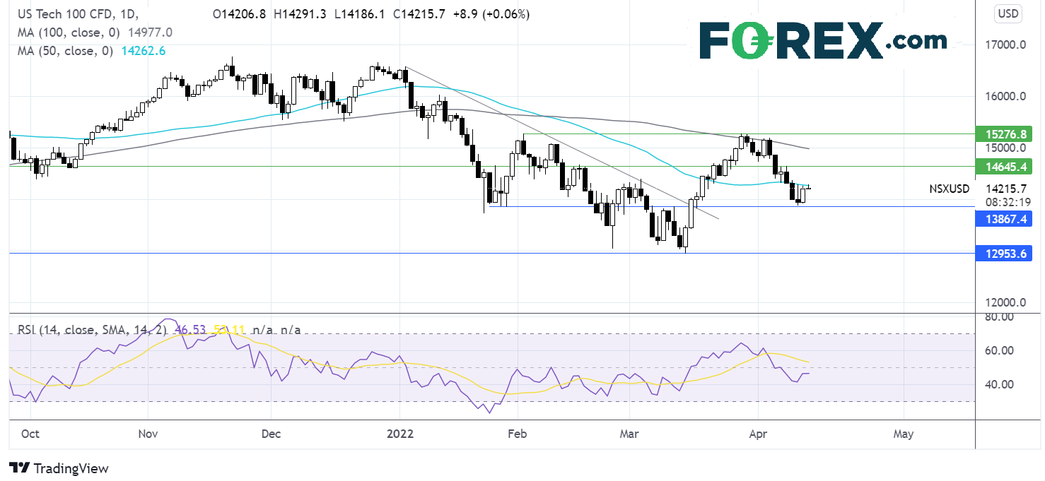 纳指在100期简单移动均线处受阻后跌至13850支撑位,此前的冲高在50期简单移动均线处受阻。RSI略低于中性水平,给出一定的信号,即突破交易为最佳策略。多头目标可能为站上50期简单移动均线,上看在过去半年多次或构成支撑或构成阻力的14650,然后上攻100期简单移动均线所在的15000下方不远处。空头目标可能是下破13850,下看13500和2022年低点12950。