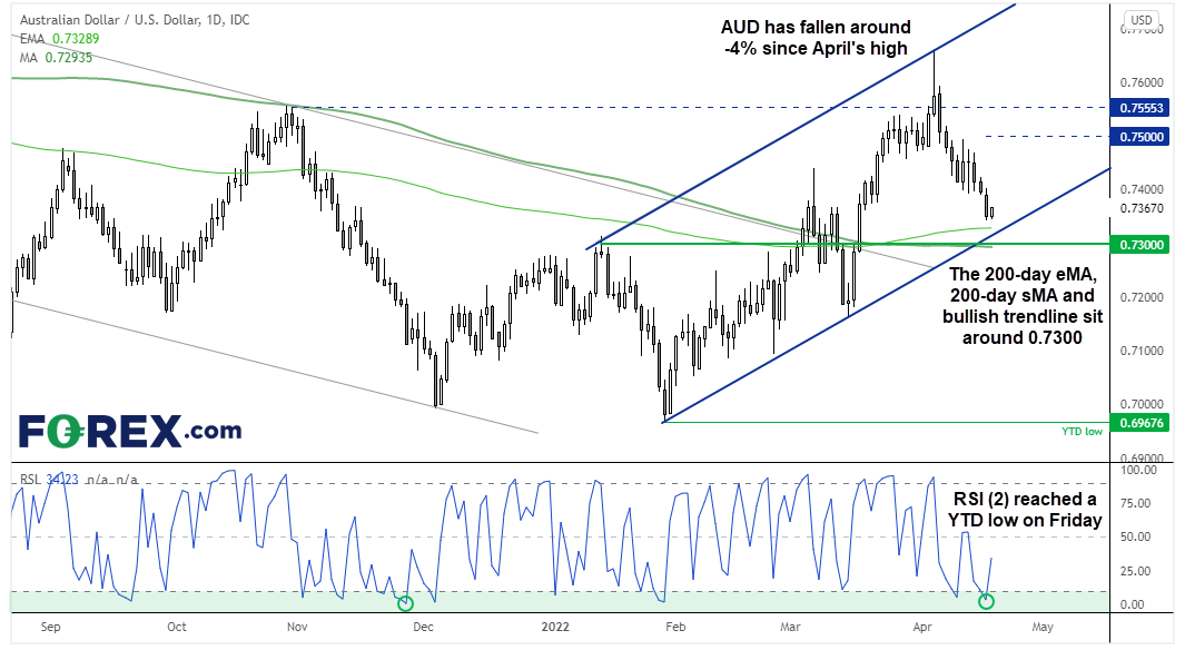 美联储为平抑飞涨的通胀而加息,或致美国经济衰退。这样的担心或引导市场今年视情况重新评估较大幅度加息的可能性。大宗商品继续构成澳元的利多,且澳元/美元4%的回调正逼近关键支撑区域。