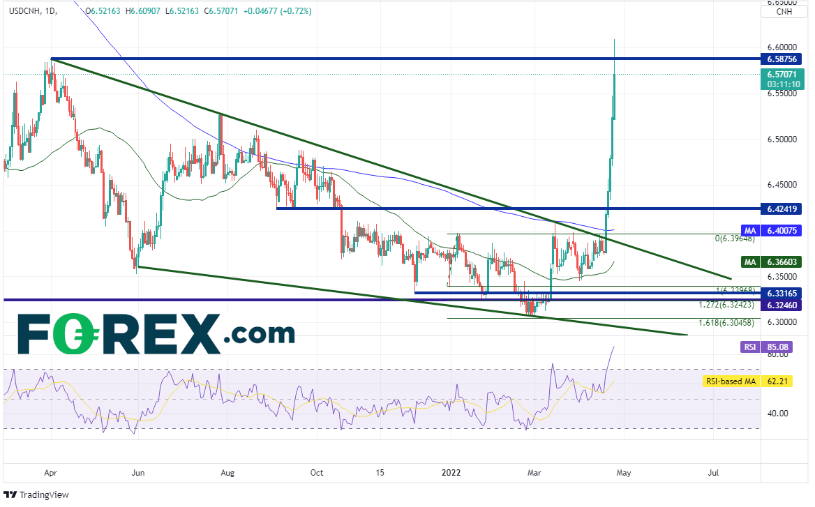 美元/离岸人民币一直交投活跃,有关新冠疫情造成更多封锁管控的担心攫住市场,因为封锁措施可致经济生产和经济增长速度放慢。上海市的封锁已进入第四周,人们担心北京市也将进入封锁管控。人民币因此下跌,并推高了美元/离岸人民币。
