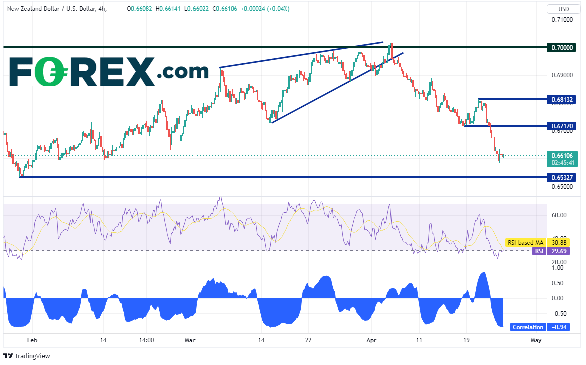纽元/美元和美元/离岸人民币在4小时图上的相关系数与澳元/美元和美元/离岸人民币的相关系数差不多,报在-0.94。请注意,纽元/美元的RSI同样处于超卖区域,表明价格可能回升,上方阻力先后落在0.6717和0.6813。但价格如果继续下跌,直至0.6533才有第一个支撑位。