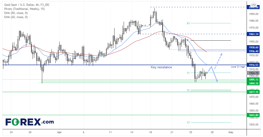金价昨天在1890.35 – 1895.13支撑区域上方构筑小型看涨内包K线,4小时图也在上抬的低点形成看涨外包K线,似乎正在上演3浪逆势行情。所以,守住1890看涨,目标1916。如果在该位调头向下,我们将转为看跌,目标1890。但如果强力站上(或日图收上)1916.50,表明回调或加大力度。