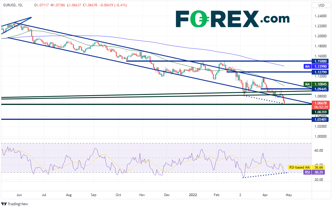 欧元/美元在美元指数中的权重超过57%,通常与美元指数反向波动。该货币对日图自20215月以来有序走低并形成下降通道,从当时的高点1.2263,到如今的低点1.0662。在美元指数挺近20203月高点之际,欧元/美元同样逼近20203月低点1.0636。如果失守,直至20171月低点1.0340才可能出现支撑。但价格与RSI正处于背离状态,表明欧元/美元短线或准备反弹。第一水平阻力位在419日低点1.0761,然后是421日形成的射日之星K线的底部1.0824
