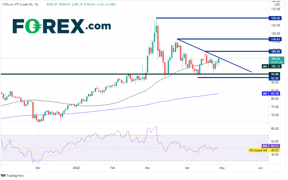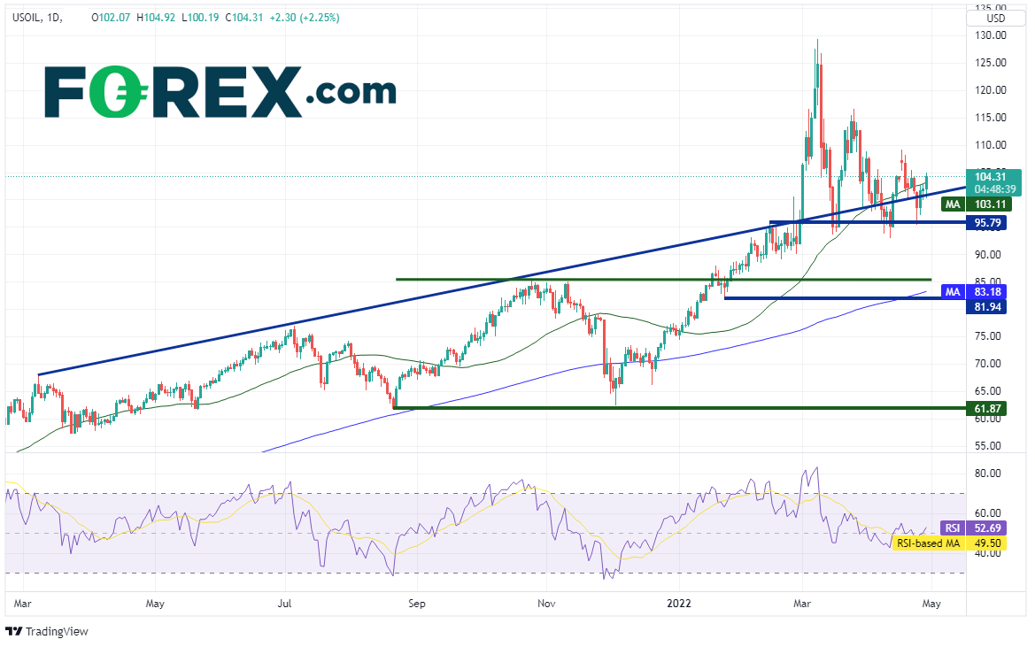 欧盟终于准备不再进口俄罗斯原油了吗?欧盟此前和其它部分国家一起一直不支持禁运,但周四有媒体报道,德国现在准备不再自俄罗斯购买原油。欧盟接下来必须找到新的能源进口来源,这点帮助西得州原油和布伦特原油今天涨逾2.5%