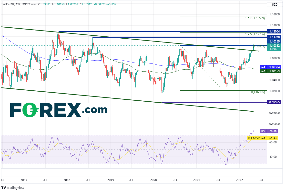 该货币对周图自2013年10月以来有序下跌,形成下降通道(请看绿色线条)。过去几周测试了通道的上轨趋势线所在的1.0925附近,今天在澳洲联储决议的刺激下暴涨并攻克通道上轨趋势线,还突破了水平阻力位1.0439,创下2018年8月以来最高点。但请注意,RSI正处于超买区域,表明价格长线或准备回撤。