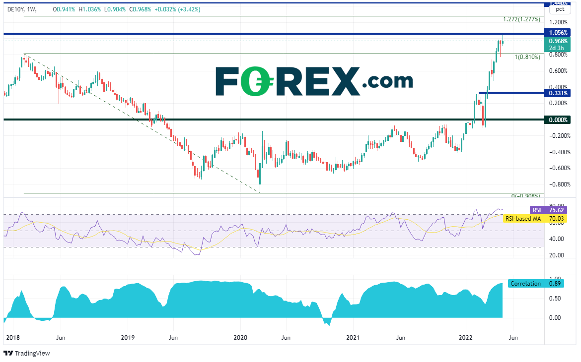 收益率涨势席卷全球,最终波及德国公债价格。欧洲基准,即德国10年期公债收益率周三自2015年6月以来首次站上1%,3月中旬还处于0%的水平。而欧洲央行官员施纳贝尔(Schnabel)的评论则激励交易者买入公债。施纳贝尔表示,支持最早于7月加息,以防极端高涨的通胀变得棘手。还记得上周发布的4月CPI年率上涨了7.5%,创下有记录最高点。3月CPI年率为7.4%,而欧洲央行对通胀的目标为2%。