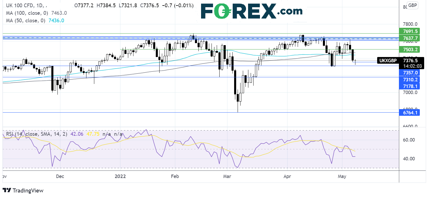 FTSE100指数上周在7620遇阻后回落并击穿了50与100期简单均线,结合RSI看跌,暗示后市或扩大下行。