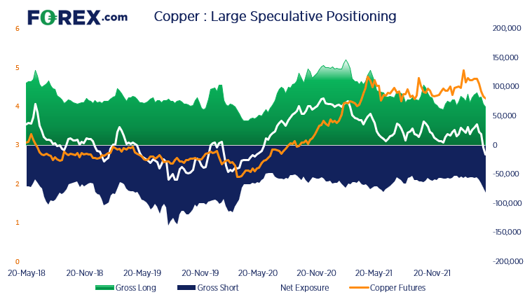 中国长期执行的严格封锁管控举措正在重创大宗商品。交易者连续第二周净做空铜期货,且持仓水平创下两年之最。但铜价仍处高位,而在中国没有马上放弃“新冠病例清零”政策迹象的环境中,铜等大宗商品有可能扩大下行。另外注意,在总空头增加的同时总多头下降,合力造就强劲的趋势。