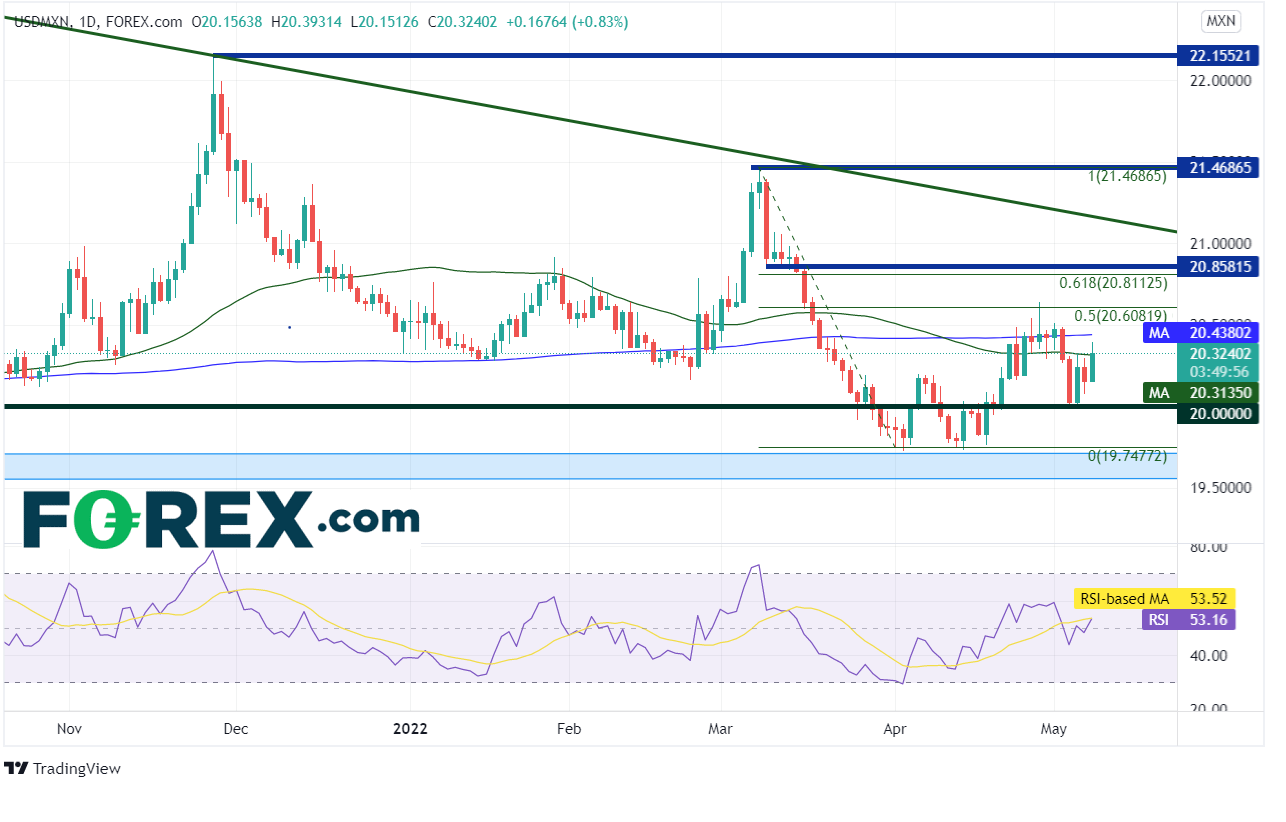 美元/墨西哥比索日图再度试图反攻,只是受制于三角形的下降趋势线。价格从3月8日的近期高点21.4686回撤至19.7477低点后到达50%回档位与支撑位,目前交投于50天移动均线和200天均线之间,即20.3135 - 20.4380区间。如果站上200天均线,可能上看4月28日高点阻力20.6380。如果攻克,或先后涨至61.8%回档位20.8112、水平阻力位20.8582。如果受制于50天均线,则可能下看前低点兼心理整数位20.00和4月4日以来低点19.7477、周图支撑区域19.5980 - 19.9068。