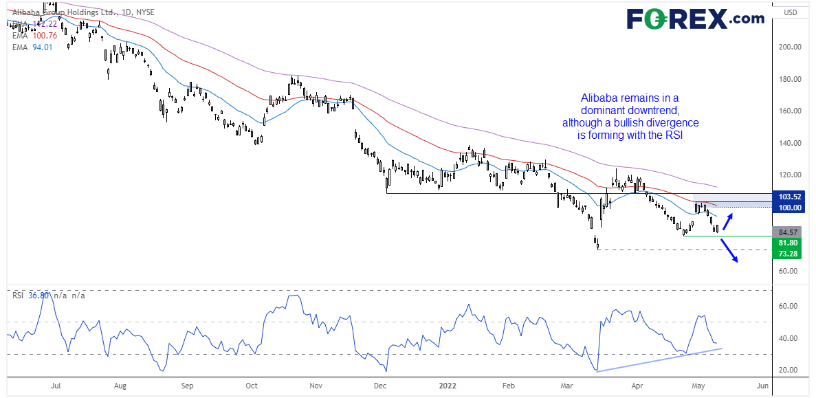 80.0附近支撑区域可能是未来一周的关键水平。请注意,RSI已构筑看涨背离,因此,若财报强劲,或诱使多头将价格推回100。但若下破81.80,则锁定73.28,若失守,则确认该股重拾主导下跌趋势。