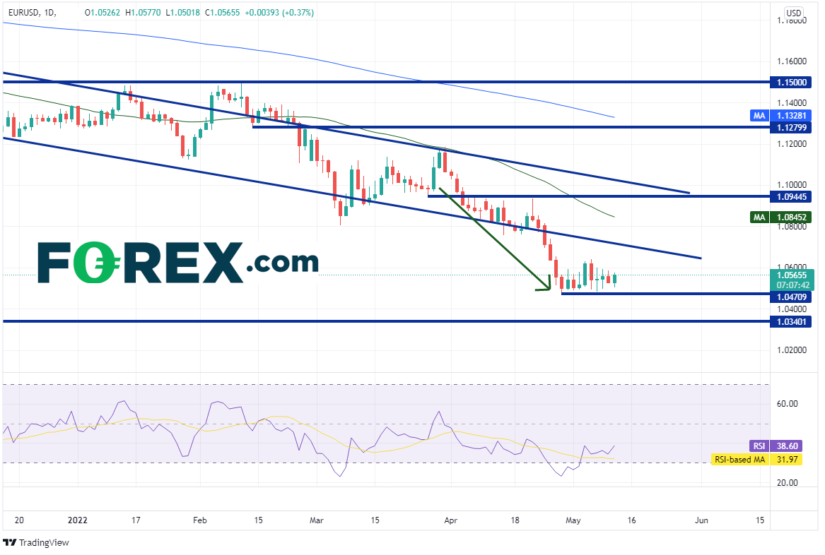 欧元/美元并没有一直得到欧洲央行近期评论的提振,但至少将3月31日以来的伤口止血。当时该货币对交投于200天均线1.1185附近,到了4月底就已跌至1.0471低点,伴随着RSI进入超卖区域,表明价格或已准备回升。