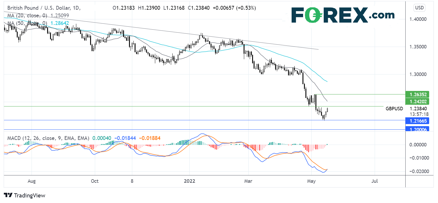 多头目标可能是重拾428日低点1.2410,再收复20期均线1.25,然后剑指5月高点1.2635
