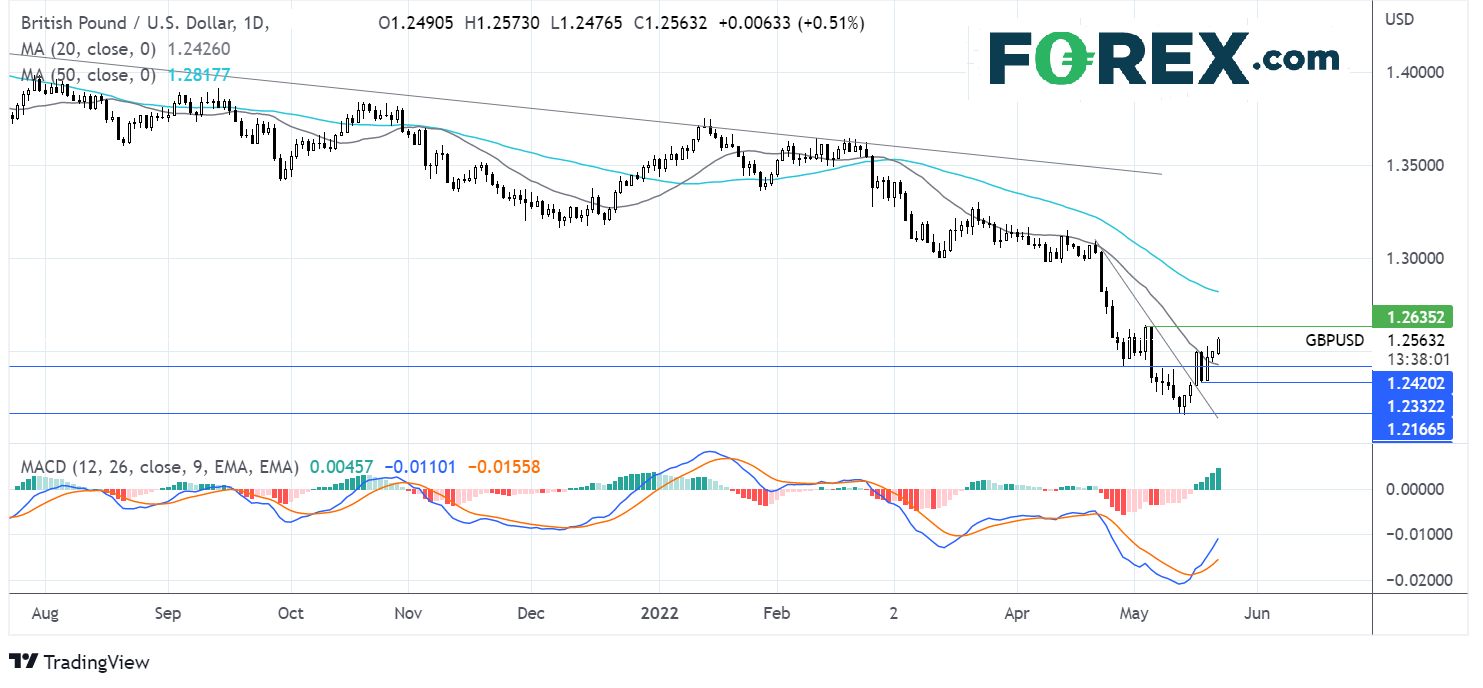 多头需要站上5月高点1.2640,才有机会扩大上涨趋势并上看50期均线1.2815。