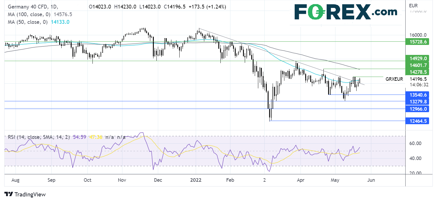 DAX正在延续自5月10日低点13280反弹的势头,站上了数月之久的下降趋势线,也收复50期均线。RSI站上50,多头因此寄望扩大上行。