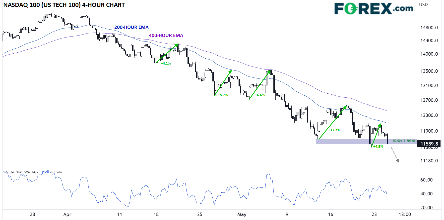 过去6周里,该股指400小时指数移动均线(4小时图上的100期指数移动均线)始终压制了这次反弹。此文发稿时,纳斯达克100指数再度面临下破至新低的风险,空头下看上周低点11,500区域。如果攻克,下方没有重要支撑位,直至202011月低点11,000附近。