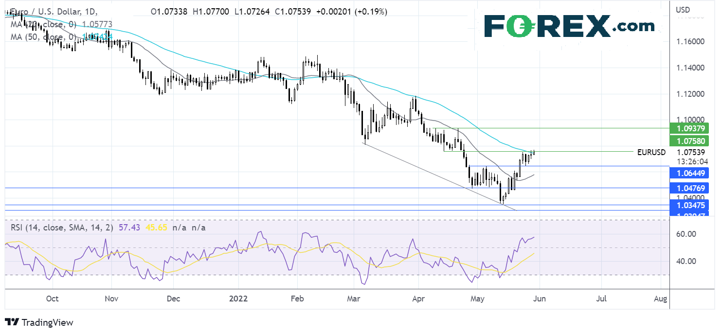 但若下跌,支撑可见于5月5日高点1.0640并下看20期均线1.0570。如果下破,短线上涨趋势可能落空,转而下看4月低点1.0470。