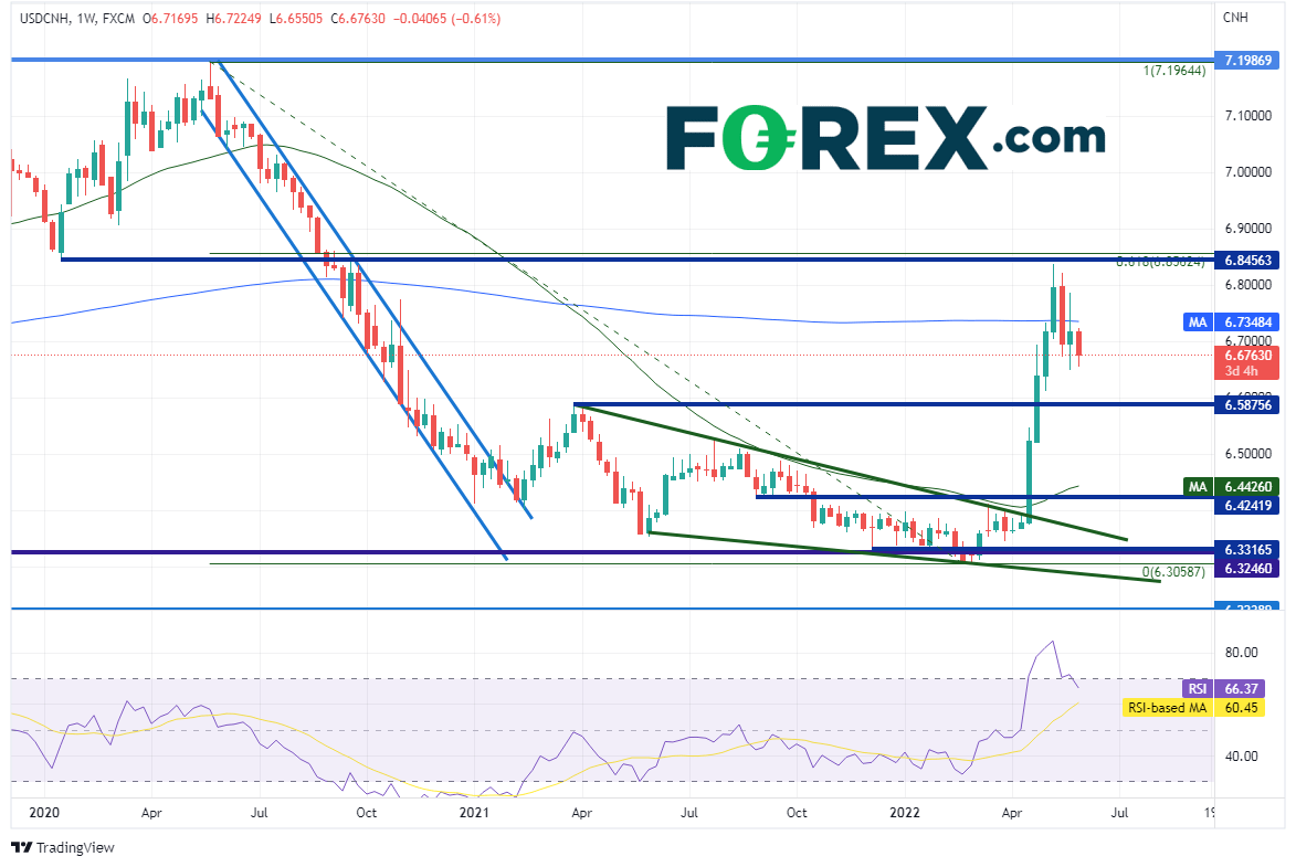 美元/离岸人民币周图自从2020年5月构筑高点以来持续交投于下降通道内,直到2021年2月18日形成低点,随后横盘脱离通道,于2021年3月-2022年4月之间在6.5876 - 6.3059形成下降楔形。在那之后因为上海市实施疫情封控,价格大举上破,于6.3958附近上破楔形,短短4周就势如破竹逼近2020年5月高点到2022年2月低点行情的61.8%回档位,即6.8375附近。2020年1月以来的水平阻力位也落在高点上方不远处。