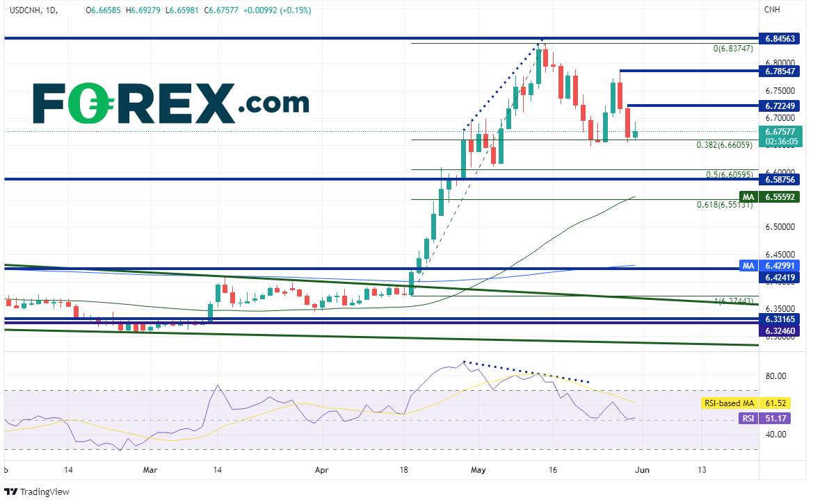 美元/离岸人民币日图自5月13日高点以来的回撤已在4月19日(突破楔形的当天)低点到5月13日高点行情的38.2%回档位,即6.6606附近企稳。请注意,RSI落在超买区域,于高点附近和价格形成背离,表明价格或已准备回撤。如果价格继续下跌,下个支撑位在前述行情的50%回档位6.6506附近。如果攻克,可能下看楔形顶部以来的水平阻力位6.5876。再然后是50天均线所在的6.5560。如果守住38.2%回档位,则第一步可能上攻昨天高点6.7225,然后上看5月27日高点6.7855。如果站于其上,有望上看5月13日以来高点6.8375。