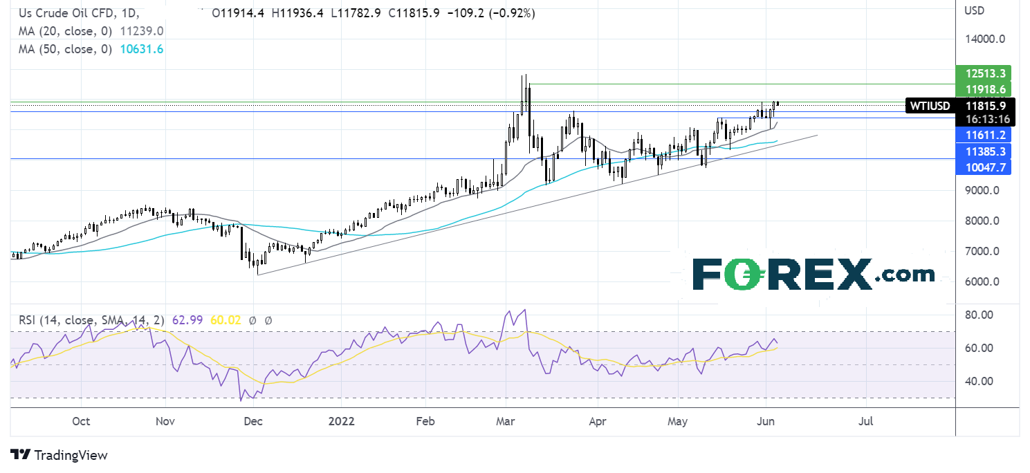 油价交投于其上升趋势线支撑和2050期均线上方,在120遇阻后略有回落。RSI支持扩大上行。