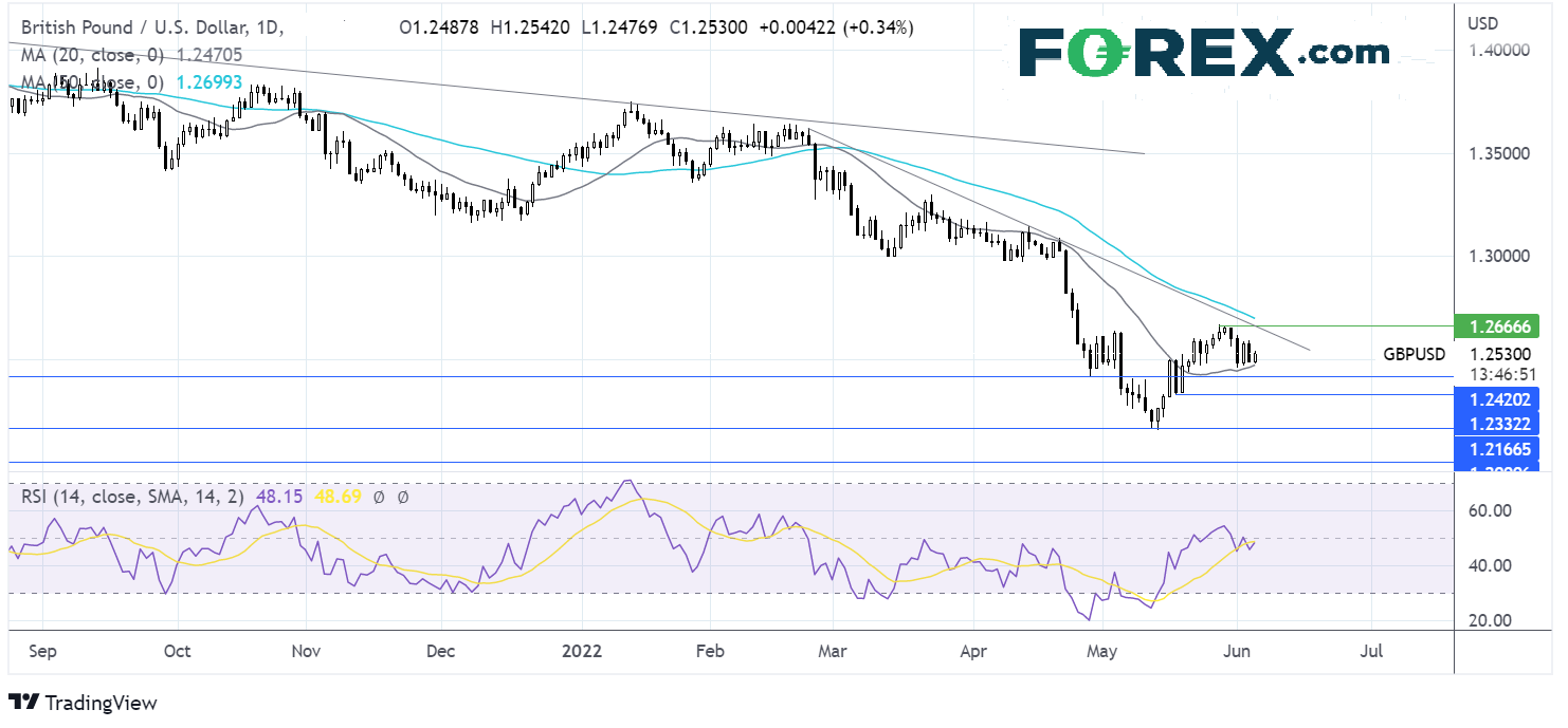 而多头的目标是攻克下降趋势线阻力以及5月高点1.2660,然后上看50期均线1.27