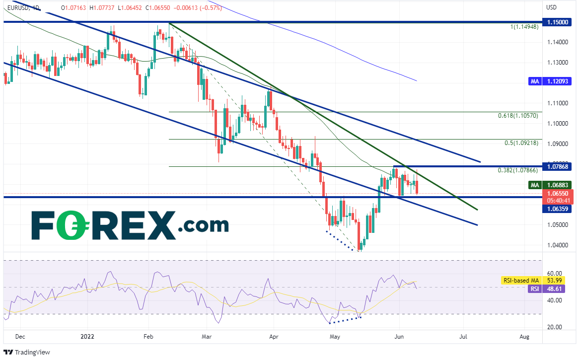 欧洲央行预告7月加息25个基点,最初推高欧元/美元。但随着新闻发布会开始讨论欧洲债券割裂的隐性问题,欧元/美元开始下跌,担心欧洲央行或需要推出新的债券购买计划。请留意1.0620,那可能是欧元/美元的多空分界线。