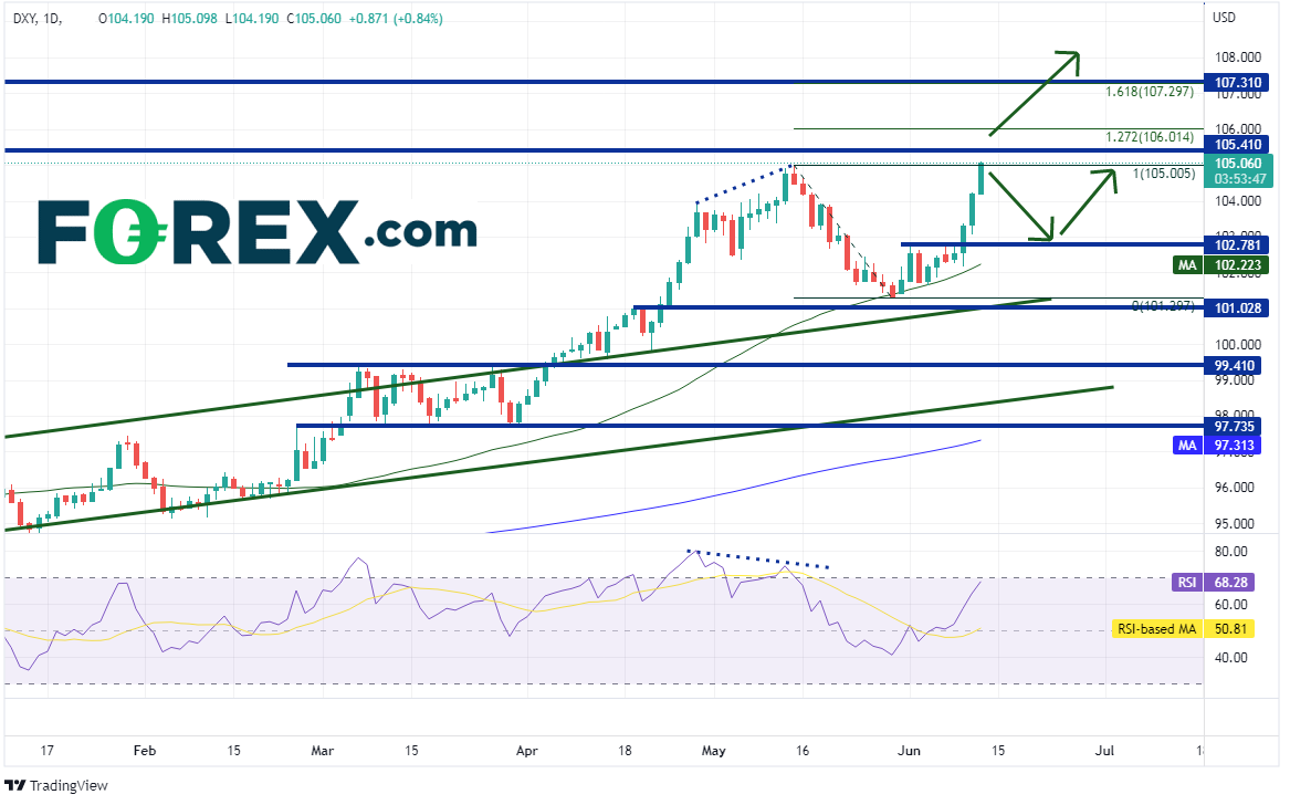如果过去几天的涨势确实是对FOMC会议预期的“抢跑”,那请小心美元指数第一步回撤至102.78支撑位。如果失守,可能先后跌至50天均线102.22和5月30日低点101.29。但若FOMC加息75个基点或在声明与新闻发布会中的措词强硬,则美元指数可望继续走高。上方面临2002年9月以来水平阻力位105.41、5月13日高点到5月30日低点行情的127.2%扩展位106.01附近、由2002年高点和前述行情的161.8%扩展位组成的阻力带107.30附近。
