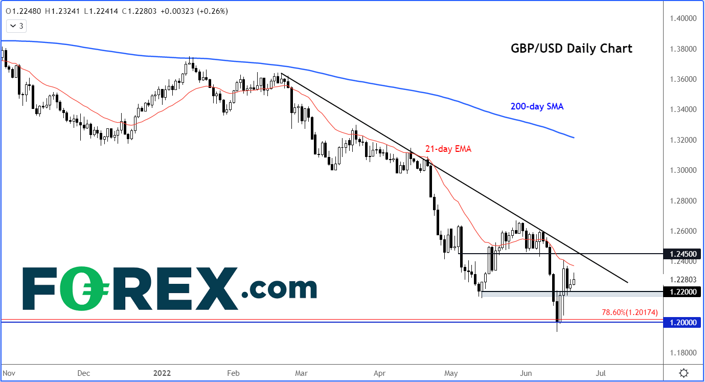 英镑/美元就是处于这样矛盾的力量当中。如果通胀数据明显回落,英镑/美元或切实企稳。但若意欲在当前的下跌趋势中取得任何可持续的涨势,必须攻克1.2450附近的关键阻力与下跌趋势线。