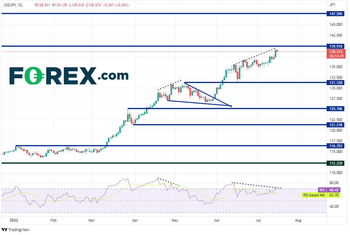 美元/日元自从311日站上116.35后大举走高,于59日摸至131.33,背后的推手是一个愈加清晰的事实,即美国通胀数据的上升,可能推动美联储加大升息力度。RSI在超买区域与价格背离,美元/日元之后回落并形成下降楔形。该货币对在531日打破楔形后继续走高,于714日到达19989月以来最高点138.94。但请注意,RSI再一次在超买区域与价格背离。这是否意味着,触及19989月高点139.91之前,价格准备再次修正?