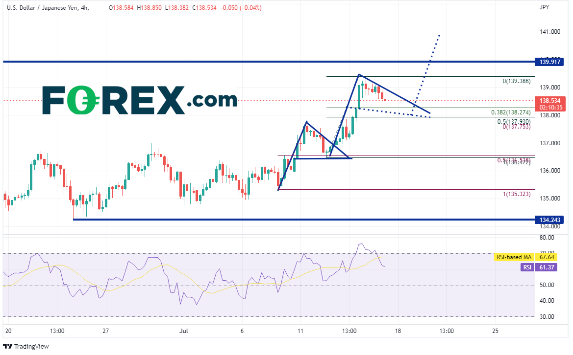 美元/日元4小时图在711日到达137.75高点,之后回撤,至77日低点到711日高点行情的50%回档位,即137.93附近,形成三角旗形态,之后打破该形态,冲高至714日高点138.94,目前回撤,可能形成新的三角旗。下方支撑位有712日低点到714日高点行情的38.2%回档位138.27,然后是同期行情的50%回档位137.93711日以来高点137.75。如果走出和之前一样的三角旗形态,价格可能从50%回档位回升,目标三角旗形态突破后的141附近。但在那之前还要攻克一些障碍,第一个就是三角旗上轨下降趋势线138.93附近,然后是714日以来高点139.3919989月高点139.91