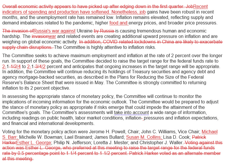 下图我们用“红色删除线”强调两次会议声明的不同,对比后我们发现政策声明只有不明显的微调: