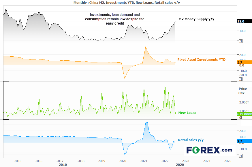 过去几周里,中国出炉了一批数据,结果不及预期,重新激起对全球经济增长放慢的恐惧心理。受到劳动力市场增长乏力、房地产市场危机与新冠病例数增加的负面作用,企业不愿增加负债,导致7月新增银行贷款不到前值的四分之一。当前背景如果不发生改变,预计信贷需求保持疲弱状态。另外,社会消费品零售总额年率降至2.7%,而城镇投资创下年内低点。房价连续第11个月下降,M2货币供应增至6年高点12%也无助于改变这样的结果。正所谓,牵马近水易,逼马饮水难。