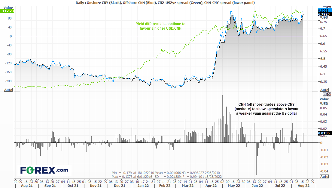 我们目前密切关注美元/离岸人民币的走势,其于昨天走出疫情爆发(2020年3月)以来涨幅最大的一天。疲弱的中国数据或给予政府允许人民币贬值以助经济发展的空间,而美中收益率差也支持汇率走高。我们注意到,离岸人民币相对在岸人民币依然存在溢价。也就是说,投机者倾向于支持美元/离岸人民币继续上扬。