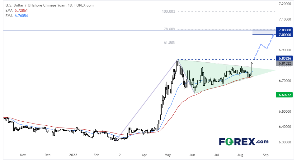 美元/离岸人民币日图在2月份启动强劲上涨趋势,但5月以来持续横盘,期间一直得到50天指数移动均线的支持。昨天的大阳线确认了上破对称三角形,该形态的潜在目标在7.000附近。该位略低于历史阻力位与78.6%回档位。