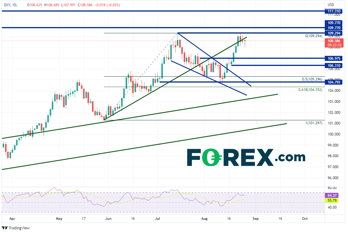 美元指数自从4月14日站上上升通道100.00附近以来大举冲高,5月30日回踩了趋势线后在7月14日摸至20年高点109.29。之后,价格回撤并形成下降楔形,最低跌至水平支撑位,就在5月30日低点到7月14日高点行情的50%回档位下方不远处的104.65。两天后,美元指数打破106附近的下降趋势线且自此再未回头。价格在周二测试了7月14日高点并守于其下,一直交投于近期水平附近,等待鲍威尔讲话。