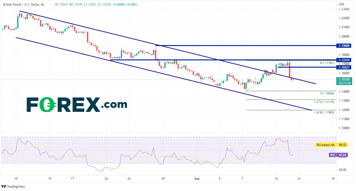 今天早些时候,美国发布了8CPI报告。结果显示,CPI年率从8.5%下降至8.3%,高于8.1%的预期值;核心CPI年率从5.9%上升至6.3%,高于6.1%的预期值。数据发布后,美元暴涨,推动英镑/美元下跌近150点子,逼近1.1530