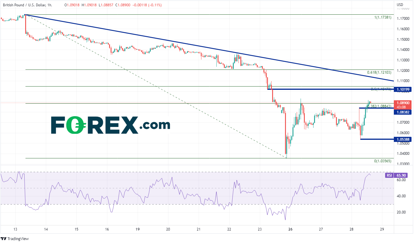 正如我的同事Fawad Razaqzada所述,英国央行的这次干预从长期来看或许不利于英镑。但正如今天动态所示,英国央行或在短期内拯救了英镑。如果英镑/美元继续上涨,上方阻力先后有水平阻力位1.1020附近、上述行情的50%回档位1.1047附近、9月13日高点以来的下降趋势线1.1135附近。下档支撑先后有英国央行宣布干预后出现的上影线高点1.0838、今天低点1.0539、历史低点1.0357。