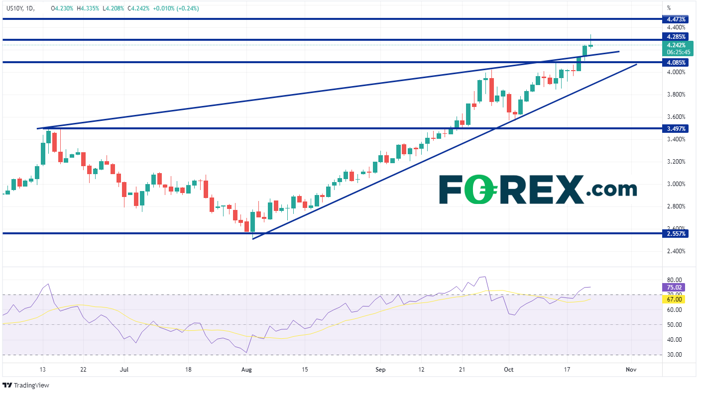 美债收益走势相似。如果美联储开始放慢加息步伐,美债收益率将放缓走势。此前10年期美债收益率按上升楔形增长,不过预期收益率将跌破这一形态。周四收益率突破上轨是否会是一次假突破?《华尔街日报》发文后,10年期美债收益率走势变动与美元指数指数相似,在冲上新高后快速反转。如果日内保持倒锤形态,国债收益率将回归楔形,测试上升楔形下轨,逼近3.85%。同时值得注意的是,RSI表现与国债收益率相反,表明将出现盘整。