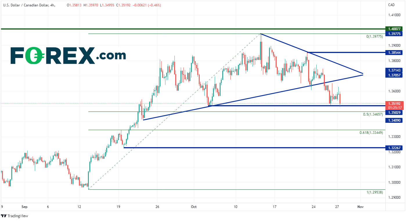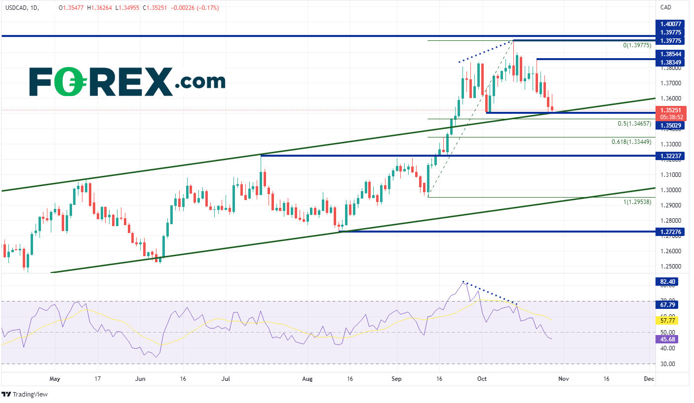 美元/加元在1013日创下近期高点1.3978,随后美元贬值,货币对交投价随之狂泻。今日数据好坏参半,难以提振美元/加元,经济走弱和高通胀信号令美元进一步承压。该货币对目前在1.3502附近交投,为104日低点形成的支撑位与921日以来长期上行通道上轨汇合处。